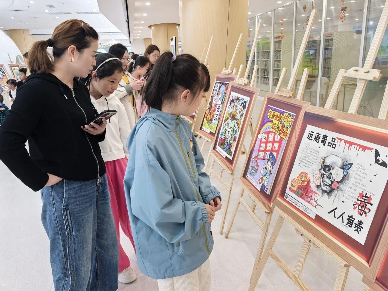 圖書館內(nèi),百余幅來自觀山湖區(qū)各中小學(xué)生的優(yōu)秀禁毒主題書畫作品精彩亮相,稚嫩的畫筆與真誠的色彩勾勒出孩子們對無毒未來的堅(jiān)定向往,向社會傳遞純凈而有力的禁毒宣言。