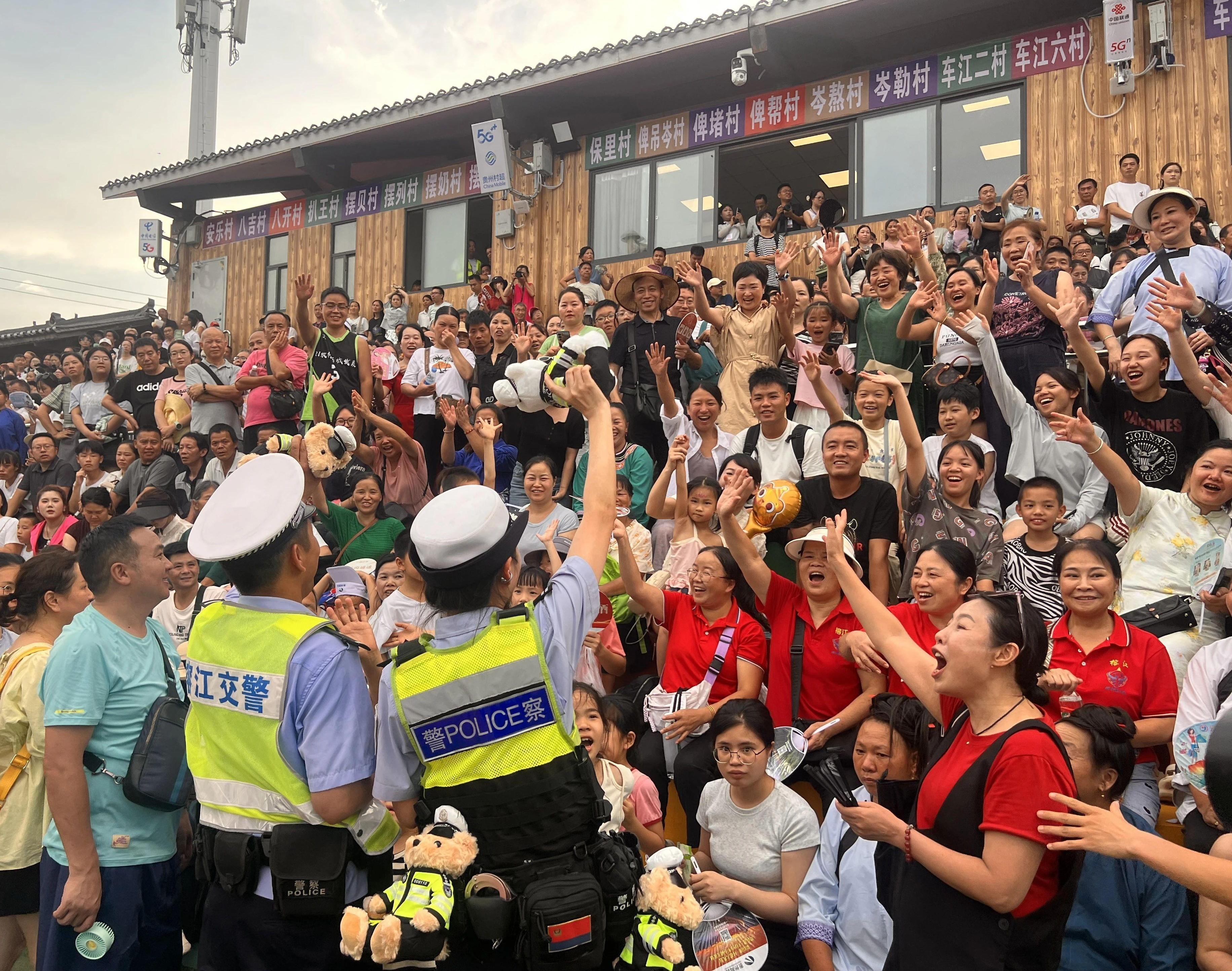 賽場內(nèi),球員們奮力拼搶,點燃激情;賽場邊,一抹特別的“熒光綠”“平安藍(lán)”同樣引人注目。貴州公安交管總隊聯(lián)合榕江交警,將交通安全課堂直接搬到了沸騰的觀眾席旁,“答題贏警用小熊”互動區(qū)人頭攢動。