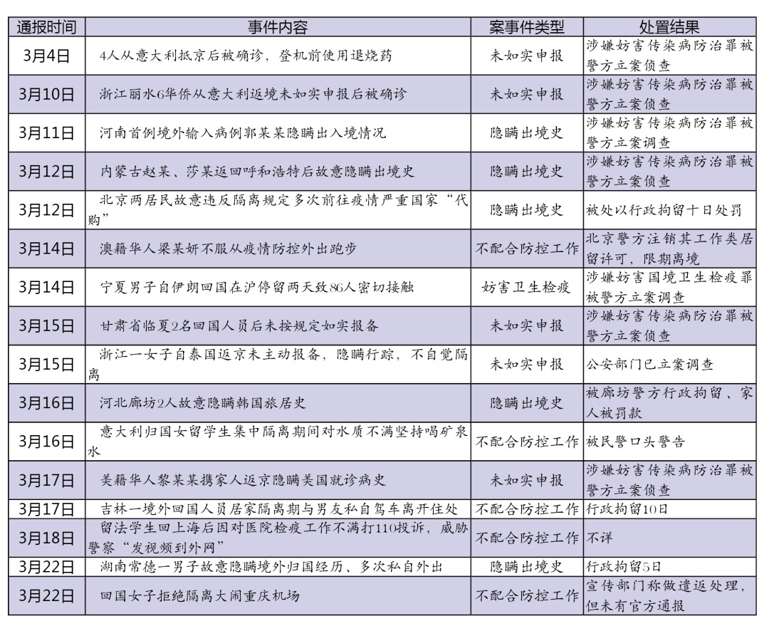 當(dāng)前,國(guó)內(nèi)疫情防控形勢(shì)持續(xù)向好,海外疫情卻在加速蔓延,一些境外人員和海外留學(xué)生選擇回國(guó)避疫,“外防輸入”成現(xiàn)階段疫情防控工作的重中之重。在此關(guān)鍵時(shí)期,少數(shù)人員采取各種手段隱瞞出境史或隱瞞病情,不遵守防疫、隔離等規(guī)定,妨害疫情防控秩序,給我國(guó)的疫情防控工作帶來(lái)巨大壓力,引發(fā)輿論高度關(guān)注。法制網(wǎng)輿情中心(ID:fzwyqzx)選取3月以來(lái)熱度較高的16起個(gè)案,簡(jiǎn)要分析其類型和處置結(jié)果,梳理輿論觀點(diǎn),并就后續(xù)處置提出應(yīng)對(duì)建議。