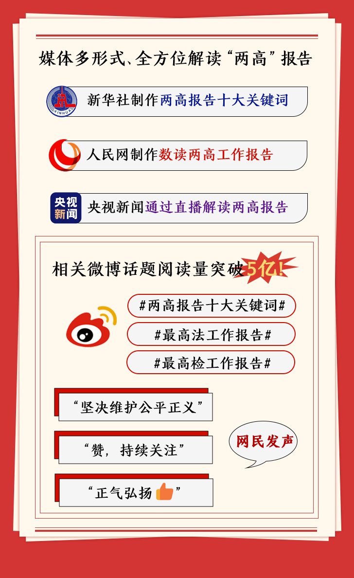 新華社制作長圖整理“兩高”報(bào)告亮點(diǎn)內(nèi)容;人民網(wǎng)用數(shù)據(jù)解讀“兩高”報(bào)告;“@央視新聞”則通過直播幫助公眾快速了解報(bào)告詮釋的法治精神?!皟筛摺眻?bào)告相關(guān)話題獲得網(wǎng)民廣泛關(guān)注,截至3月8日8時(shí),“#兩高報(bào)告十大關(guān)鍵詞#”等微博話題閱讀量累計(jì)超5億。