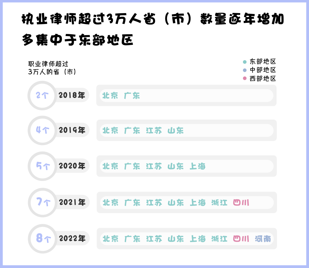 1. 律師人數(shù)超過(guò)3萬(wàn)人的?。ㄊ校┒喾植荚跂|部地區(qū)