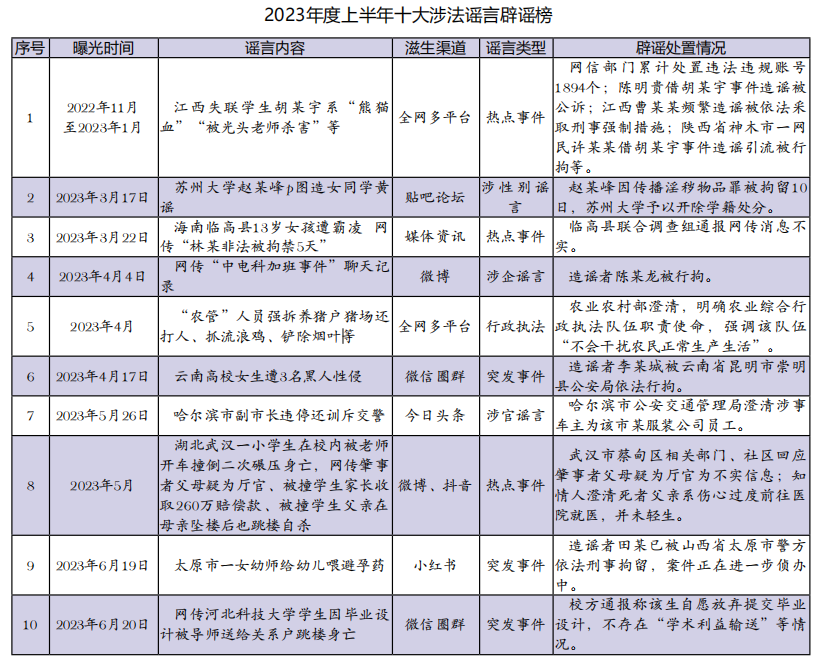 近年來(lái),網(wǎng)絡(luò)謠言成為擾亂輿論秩序的一大頑疾,政法機(jī)關(guān)更是頻頻牽涉其中,亟需有效打擊。本研究匯總2023年上半年共242起網(wǎng)絡(luò)涉法謠言,從中總結(jié)出2023年上半年涉法網(wǎng)絡(luò)謠言特征,并圍繞謠言治理工作提出建議,供有關(guān)部門參考。
