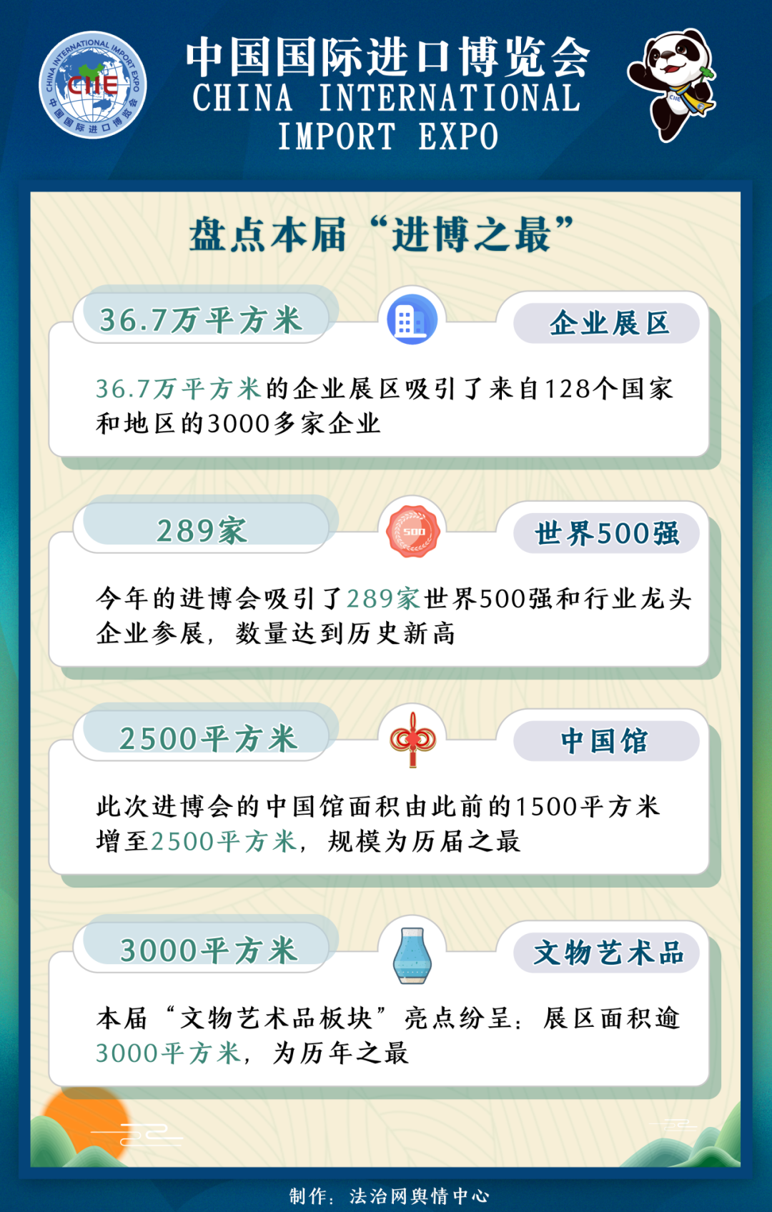 第六屆進博會將創(chuàng)造多個“歷史之最”:今年進博會企業(yè)展的展覽面積達到36.7萬平方米,吸引了128個國家和地區(qū)的3000多家企業(yè),規(guī)模為歷史之最;289家世界500強和行業(yè)龍頭企業(yè)參展,數(shù)量達到歷史新高;中國館升級擴容,展覽面積由此前的1500平方米增至2500平方米,規(guī)模為歷屆之最;“文物藝術(shù)品板塊”的展區(qū)面積逾3000平方米,為歷屆之最。