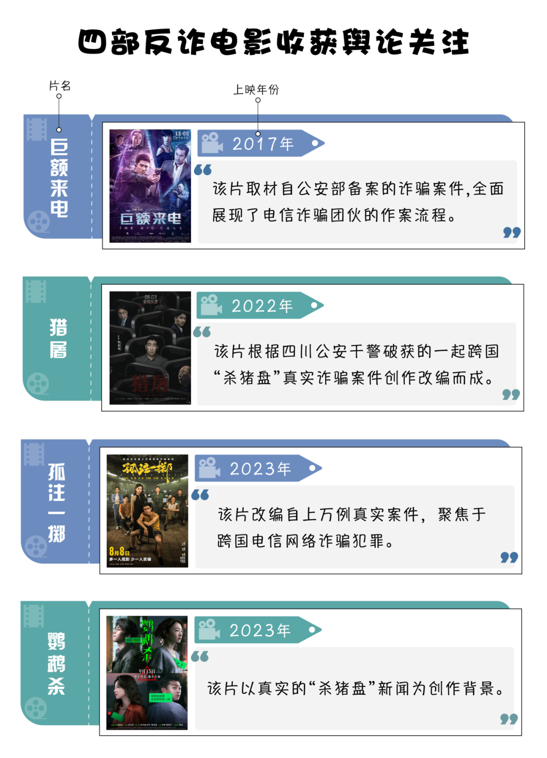 四部反電詐電影中,上映時間最早的是《巨額來電》,上映時間為2017年底,可以算作反電詐電影中的“前輩”。2022年5月10日,中宣部、公安部聯(lián)合啟動“全民反詐在行動”集中宣傳月活動,同年8月《獵屠》上映。2023年,公安機(jī)關(guān)對打擊電信網(wǎng)絡(luò)詐騙犯罪的力度不斷加大,宣傳力度隨之加強(qiáng),《孤注一擲》《鸚鵡殺》等兩部電影上映,引發(fā)輿論熱烈反響。以上四部電影均取材于真實案例,讓觀眾真實了解電信網(wǎng)絡(luò)詐騙的危害,進(jìn)而提升自身防范意識。