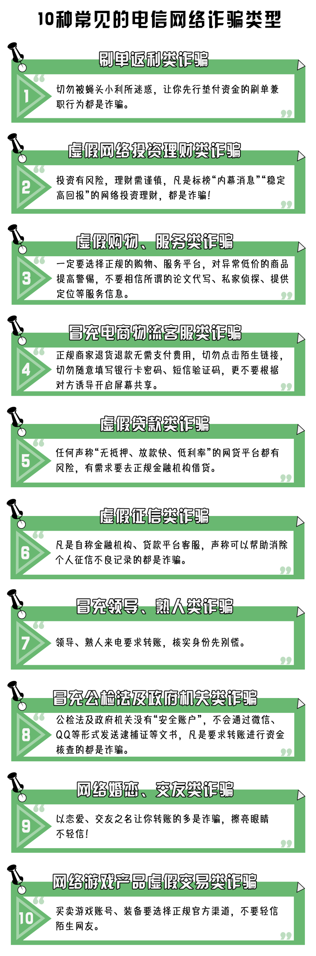 公安部公布了十大高發(fā)電信網(wǎng)絡(luò)詐騙類型,包括刷單返利、虛假網(wǎng)絡(luò)投資理財、虛假購物服務(wù)、冒充電商物流客服、虛假征信等常見類型及典型案例。