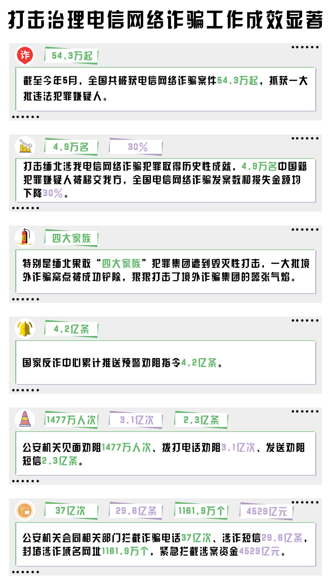 2023年以來,在黨中央的堅強領(lǐng)導(dǎo)下,各地各部門牢固樹立以人民為中心的發(fā)展思想,深入貫徹落實《中華人民共和國反電信網(wǎng)絡(luò)詐騙法》,深化運用“四專兩合力”總體思路,全力推進打防管控建各項措施,打擊治理工作取得明顯成效。