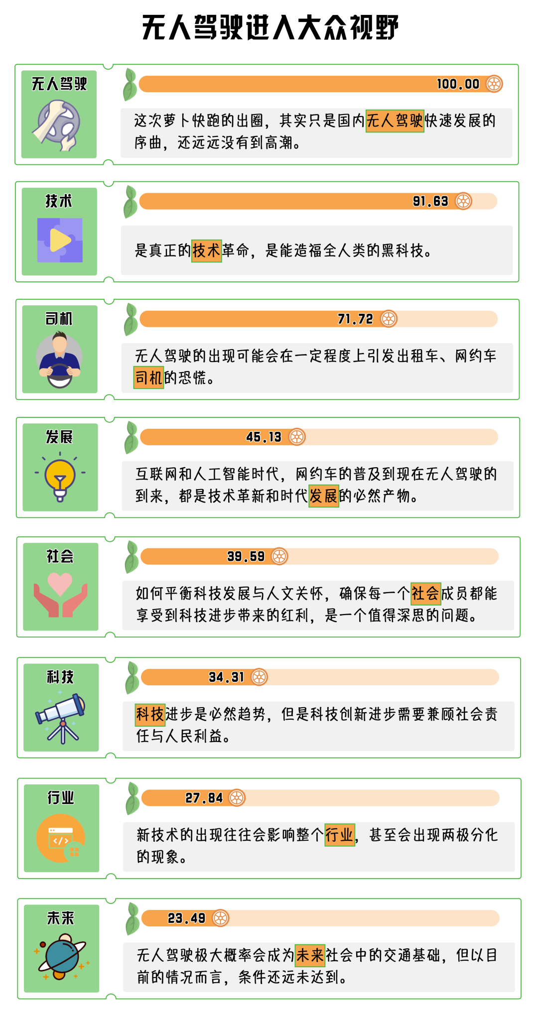 (制作:法治網(wǎng)輿情中心 數(shù)據(jù)來源:收集知乎問題“你怎么看百度無人駕駛蘿卜快跑”下的1300個回答,對選取的回答進行數(shù)據(jù)清洗及自然語言處理,將熱度最高的詞語規(guī)定為100)
