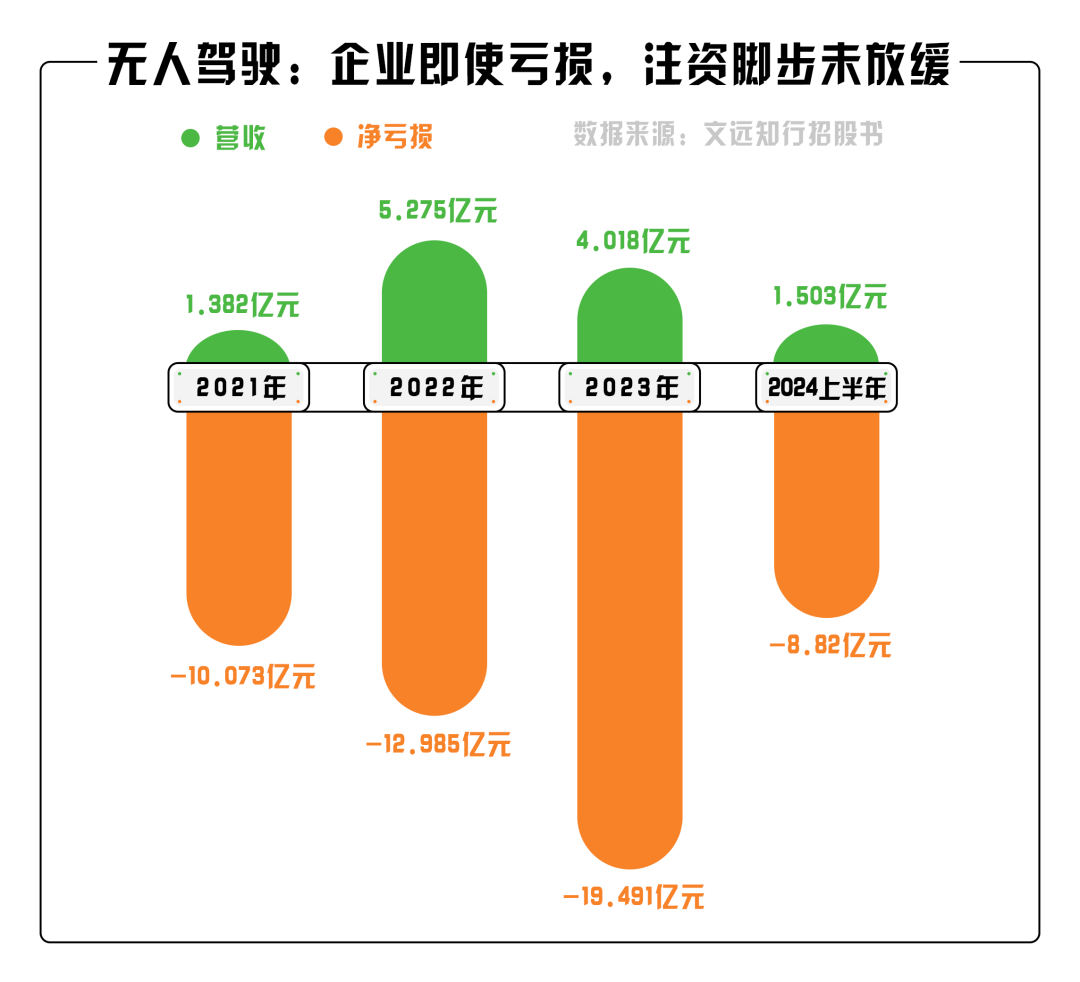 以行業(yè)獨角獸——文遠知行為例,打開文遠知行的官網(wǎng),映入眼簾的“以無人駕駛改變?nèi)祟惓鲂小钡目谔柛裢庖俗⒛?。根?jù)文遠知行招股書的數(shù)據(jù),2021年至2024年上半年,文遠知行實現(xiàn)營收分別為1.382億元、5.275億元、4.018億元、1.503億元,分別凈虧損10.073億元、12.985億元、19.491億元、8.82億元,三年半凈虧損超51億元,依舊沒能阻擋文遠知行前進的腳步,也從側(cè)面體現(xiàn)出無人駕駛新一輪“內(nèi)卷”似乎已經(jīng)來臨。