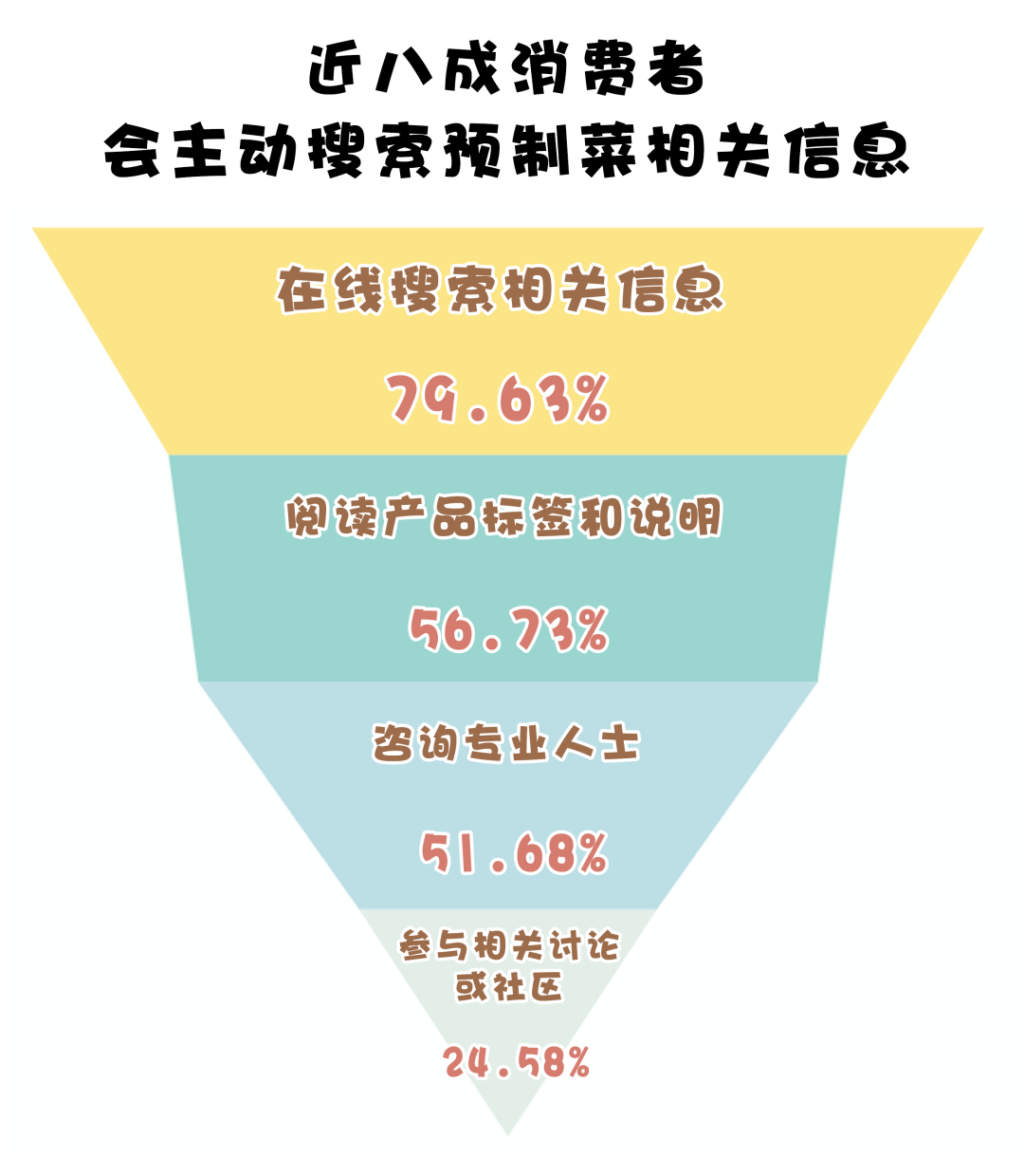 預(yù)制菜食品安全問題令受消費者尤為關(guān)注。從艾媒咨詢發(fā)布的數(shù)據(jù)來看,近八成的消費者會主動搜索預(yù)制菜相關(guān)信息,超過五成的消費者會通過閱讀產(chǎn)品標(biāo)簽和說明、咨詢專業(yè)人士來確保自己吃到的是安全健康的預(yù)制菜。