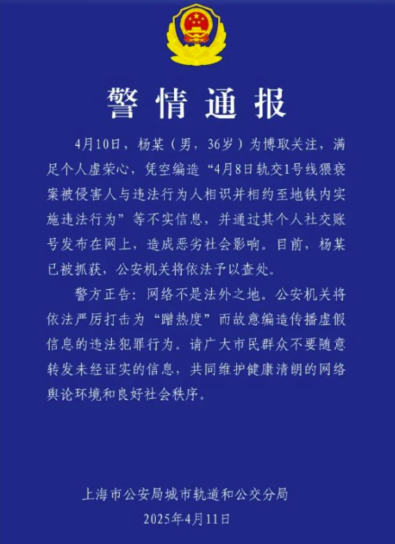 4月11日9時(shí)29分,“@軌交幺幺零”再發(fā)通報(bào)稱,男子楊某為博取關(guān)注,憑空編造“軌交1號線猥褻案男女雙方相識(shí)”謠言,發(fā)布到網(wǎng)上后造成惡劣影響,目前已被抓獲。官方通報(bào)再掀一波討論熱潮,微博轉(zhuǎn)評2萬余次、點(diǎn)贊超26萬次,“進(jìn)去得好”“還是官方速度快”等評論獲得網(wǎng)民點(diǎn)贊認(rèn)同。紅星新聞、極目新聞等媒體發(fā)文稱,“造黃謠和性騷擾都該人人喊打”;部分網(wǎng)民言論涉及性別對立話題,如“出手相助的是女的,猥褻造謠的都是男的”。截至4月17日12時(shí),該事件相關(guān)輿情信息量超8萬條,“#上海地鐵一男子疑脫褲猥褻女乘客#”“#上海辟謠地鐵猥褻事件當(dāng)事人相識(shí)#”等數(shù)十個(gè)關(guān)聯(lián)微話題累計(jì)閱讀量超6億。
