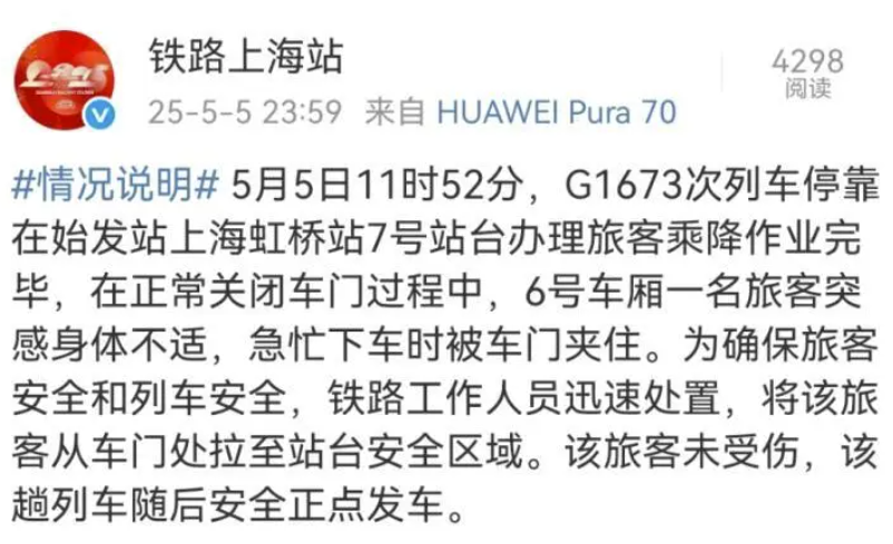 5月5日,網(wǎng)傳上海虹橋高鐵站又現(xiàn)“女子阻礙高鐵關(guān)門”事件。視頻顯示,有目擊者稱,女子此舉是為了等后面的老太太。當(dāng)日深夜,“@鐵路上海站”通報稱,當(dāng)事旅客因突感身體不適,急忙下車時被門夾住,工作人員迅速將其拉至安全區(qū)域。該旅客未受傷,該趟列車隨后安全正點(diǎn)發(fā)車。通報發(fā)出后,多數(shù)網(wǎng)民表示理解,但也有網(wǎng)民并不認(rèn)同上海鐵路方的處理方式,認(rèn)為如果以后都可以用這些理由,會引發(fā)更多人效仿。