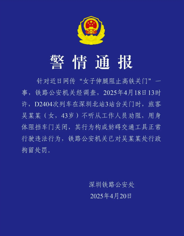 4月18日,一段“女子伸腿阻止高鐵關(guān)門”的視頻在網(wǎng)絡(luò)上引起熱議。視頻中,一名女性旅客強(qiáng)行用身體阻攔車門,兩名工作人員極力制止卻未能成功,直到三名同行人上車才離開車門,隨后列車關(guān)門駛離。4月19日,“@廣鐵集團(tuán)深圳北火車站”發(fā)布情況說明,證實(shí)網(wǎng)傳視頻屬實(shí),并稱未造成列車晚點(diǎn),相關(guān)部門已介入調(diào)查。輿論要求嚴(yán)懲行為人呼聲較高,部分網(wǎng)民不滿工作人員制止不力,對相關(guān)法律規(guī)章制度未嚴(yán)格執(zhí)行。4月20日,深圳鐵路公安處官方微博通報稱,旅客吳某某行為構(gòu)成妨礙交通工具正常行駛違法行為,已被行政拘留。主流輿論點(diǎn)贊警方處置及時,并圍繞“攔門事件何時休”展開討論。如中國網(wǎng)發(fā)文建議,修訂《鐵路安全管理?xiàng)l例》,明確阻礙發(fā)車的量化處罰標(biāo)準(zhǔn),如按延誤時長階梯式罰款。上觀新聞、紅網(wǎng)發(fā)文稱,鐵路部門應(yīng)加大處罰力度,將“危害安全行為”納入個人征信系統(tǒng)、列入限行“黑名單”,形成更強(qiáng)的震懾效應(yīng)。