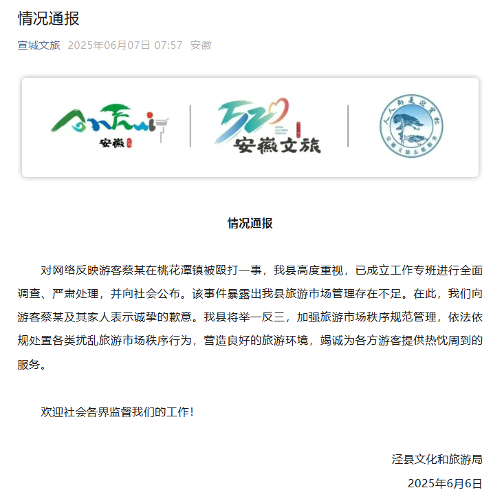 6月7日0時(shí)許,涇縣文化和旅游局發(fā)布情況通報(bào)稱,已成立工作專班進(jìn)行全面調(diào)查,向游客蔡某及其家人致歉。但輿論怒火并未完全平息,不少網(wǎng)民表示不能僅讓文旅部門“背鍋”,當(dāng)?shù)毓矙C(jī)關(guān)應(yīng)深入調(diào)查、嚴(yán)肅問責(zé)。據(jù)微信公眾號(hào)“涇縣人民政府發(fā)布”7日晚消息,涇縣召開全縣旅游市場秩序整治工作會(huì)議,會(huì)議要求“聚焦短板弱項(xiàng),抓好旅游市場秩序整治”等。