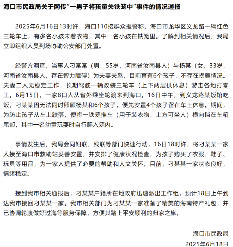 海口市民政局關(guān)于網(wǎng)傳“一男子將孩童關(guān)鐵籠中”事件的情況通報