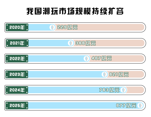 潮玩市場規(guī)模持續(xù)擴張奠定基礎。據《2025-2030年中國潮流玩具深度分析及發(fā)展前景研究預測報告》數據顯示,2020-2024年中國潮流玩具市場規(guī)模已經從229億元攀升至763億元,且預計2025年突破877億元。潮玩市場擴容,大批消費者持續(xù)涌入,為培育LABUBU這樣的優(yōu)質IP提供了肥沃的土壤。