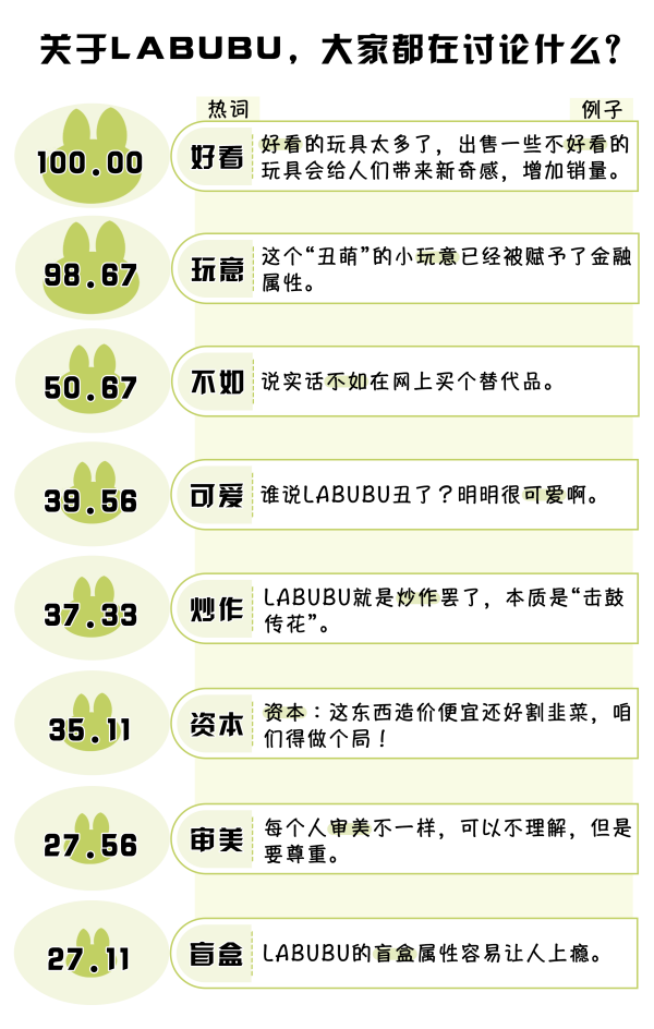 (數據來源:選取嗶哩嗶哩視頻《“丑東西”LABUBU,憑什么能讓全球富婆們上癮?》下的2976條一級評論及彈幕,做分詞及歸一化處理,進行分詞后將熱度最高的詞語規(guī)定為100)