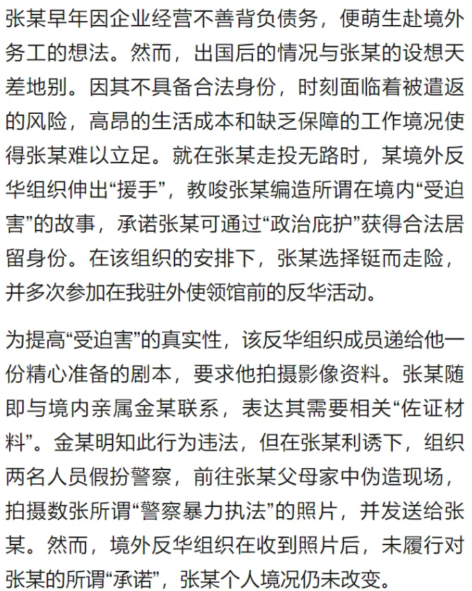 4. “境外反華組織教唆擺拍暴力執(zhí)法” 案。8月14日,國家安全部公布一起標(biāo)題為《跨境賣慘終成空》的案例。據(jù)悉,張某國內(nèi)企業(yè)經(jīng)營不善負(fù)債,赴境外務(wù)工后因無合法身份面臨遣返風(fēng)險。境外反華組織以“政治庇護(hù)換取居留身份”為誘餌,提供詳細(xì)拍攝劇本,還提出“畫面暴力血腥”“效果要慘”“抓拍增強(qiáng)真實(shí)感”等要求。在反華組織教唆下,張某聯(lián)系到親屬金某,金某明知此行為違法,但在張某利誘下組織兩名人員假扮警察,前往張某父母家中偽造現(xiàn)場,拍攝數(shù)張所謂“警察暴力執(zhí)法”的照片,并將材料發(fā)送境外,但境外反華組織在收到照片后未履行對張某的所謂“承諾”。該案最終被國家安全機(jī)關(guān)破獲。央視網(wǎng)、微信公眾號“俠客島”等轉(zhuǎn)發(fā)相關(guān)內(nèi)容。輿論將此案稱為一場“政治避難”鬧劇,指出“因一己之利參加境外反華活動,為反華勢力提供煽宣‘彈藥’,但最終竹籃打水一場空”。