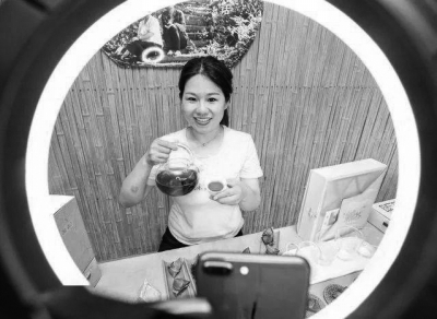 安徽省黃山市“巾幗新農(nóng)人”、祁門(mén)縣際源春茶業(yè)有限公司總經(jīng)理江雪霞在直播銷售粽茶。 陳晨/攝