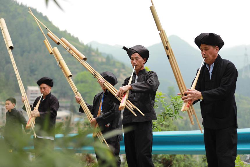 4月22日,新民村村民同外地游客同跳蘆笙舞,歡慶高雍苗族“三月三”。