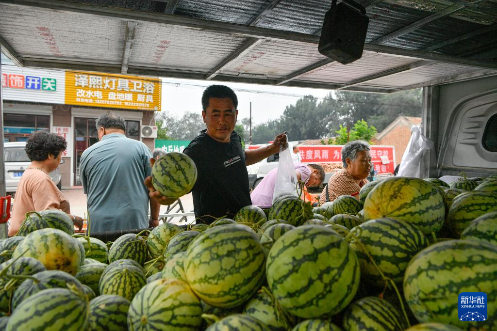 8月25日,在天津市靜海區(qū)臺頭鎮(zhèn),商戶為前來趕集的村民挑選臺頭西瓜。記者 孫凡越 攝