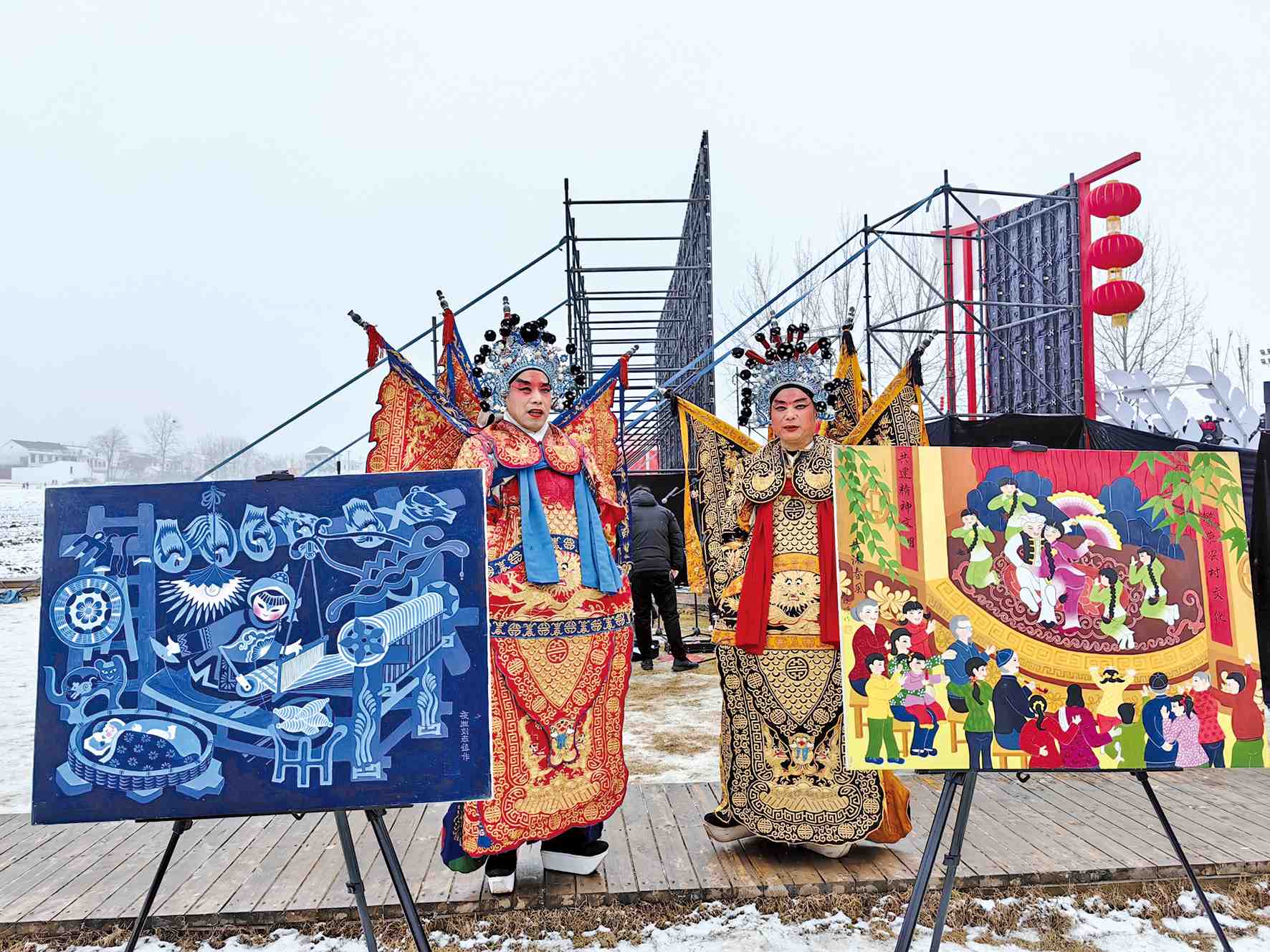 在年畫展覽旁候場(chǎng)的演員