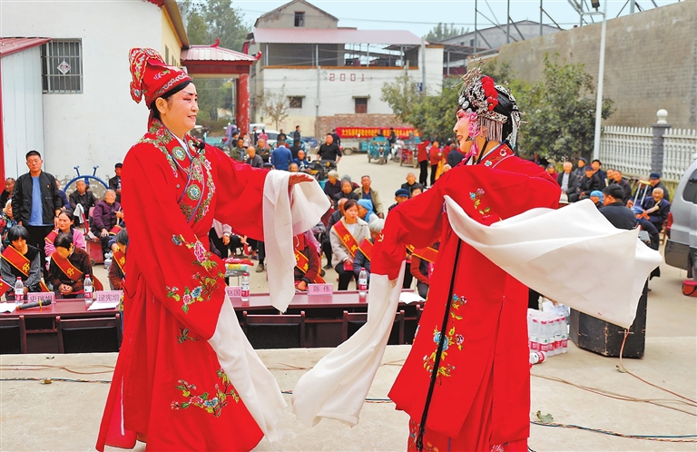 “祖國的大建設(shè)一日千里,看不完說不盡勝利的消息……”在尉氏縣南曹鄉(xiāng)前孫村的鄉(xiāng)村大舞臺上,隨著韻味十足的唱腔響起,臺上的“演員”全情投入,臺下觀看的村民如癡如醉,臺下臺上融為一體,都沉浸在一片歡樂的氣氛之中。