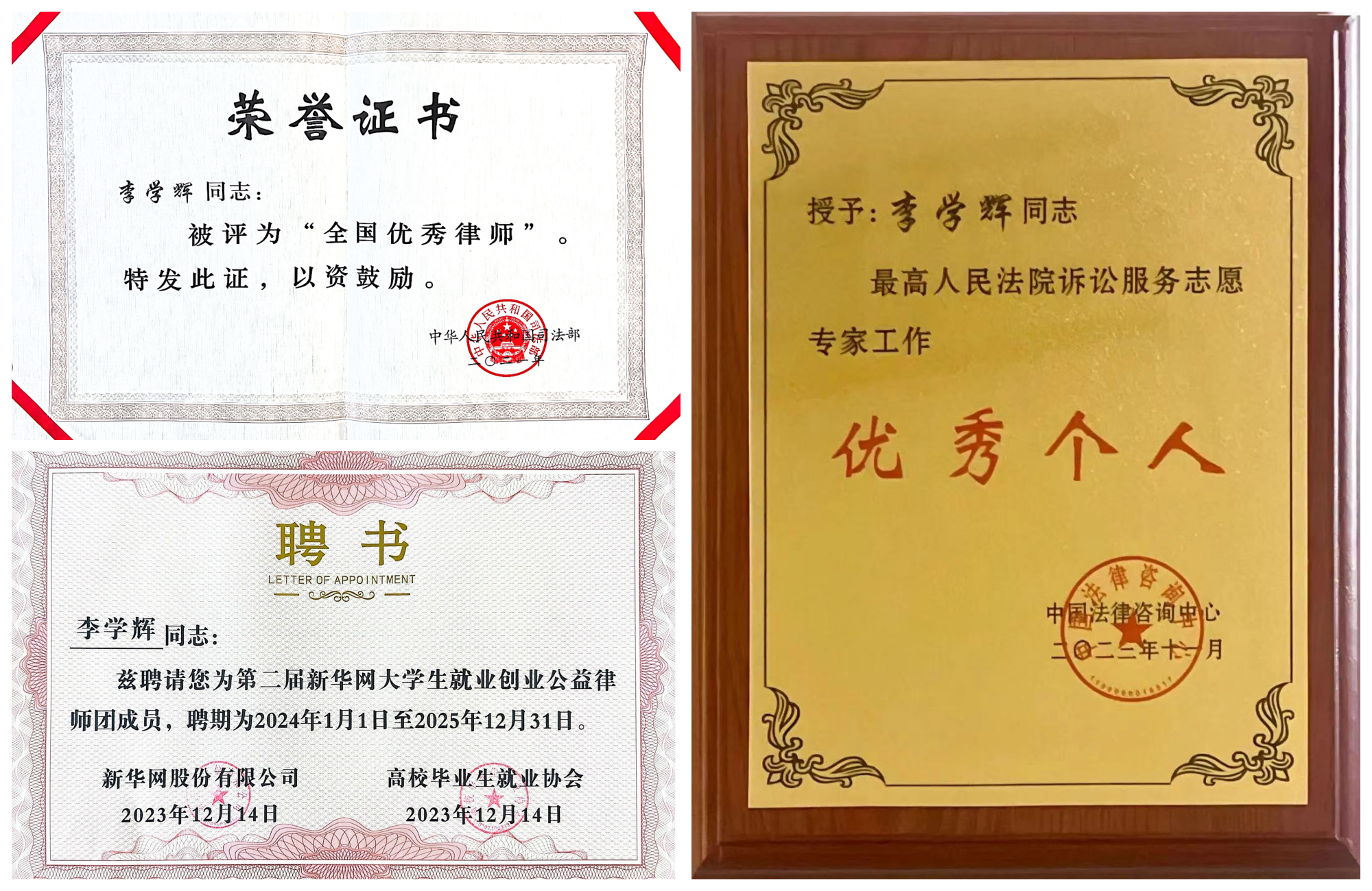 從業(yè)逾二十年,得益于過硬的專業(yè)能力、較高的學(xué)歷條件、良好的人際關(guān)系和高效的組織能力,李學(xué)輝陸續(xù)取得一系列的行業(yè)職務(wù)和社會頭銜:海峽兩岸法學(xué)交流促進(jìn)會副會長、中國法學(xué)會律師法學(xué)研究會副會長、北京市朝陽區(qū)律師協(xié)會副會長、最高人民法院訴訟服務(wù)志愿專家、最高人民檢察院民事行政案件咨詢專家。還獲得過全國優(yōu)秀律師、北京市優(yōu)秀律師、北京市律師行業(yè)優(yōu)秀共產(chǎn)黨員等榮譽(yù)。