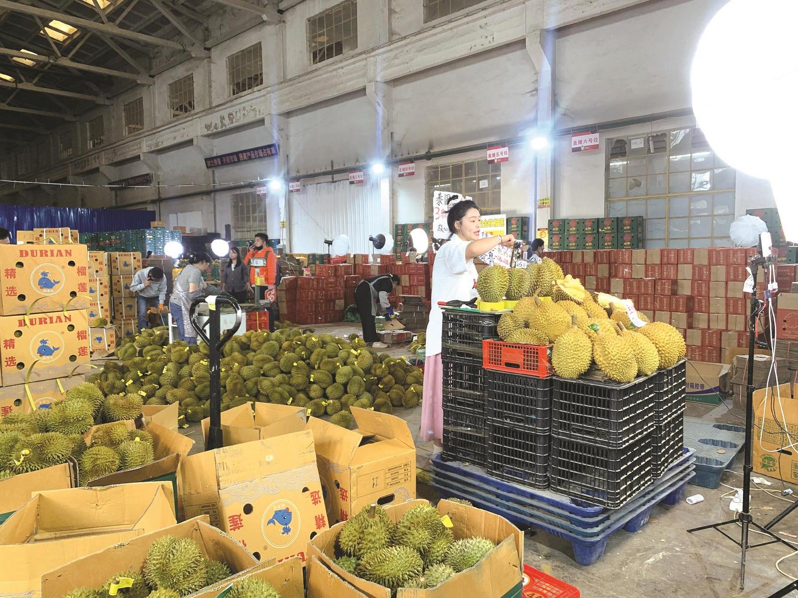 5月初的一個(gè)上午,記者在云南思珺兒生鮮供應(yīng)鏈基地看到,一筐筐沃柑、藍(lán)莓、人參果,以及從泰國(guó)運(yùn)來(lái)的榴蓮、山竹堆滿了倉(cāng)庫(kù),散發(fā)出濃濃果香。而在卸貨區(qū)的另一側(cè),分出了眾多直播區(qū),在兩盞燈、幾部手機(jī)前,一位主播正情緒飽滿地向屏幕前的粉絲介紹果品、釋疑解惑,一個(gè)個(gè)直播的小天地外,選果、打包更是一派繁忙景象。