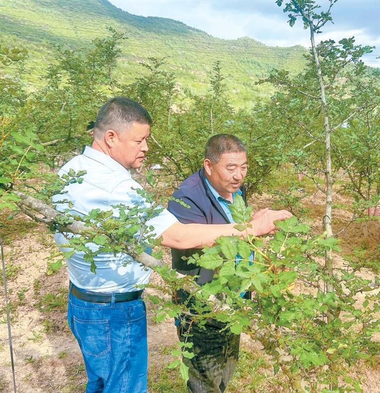 羅小利(右)向林果專家學習花椒管理技術 記者 張子恒 攝