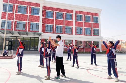 體育教師正在指導(dǎo)策勒縣小學(xué)生練習(xí)少兒八段錦