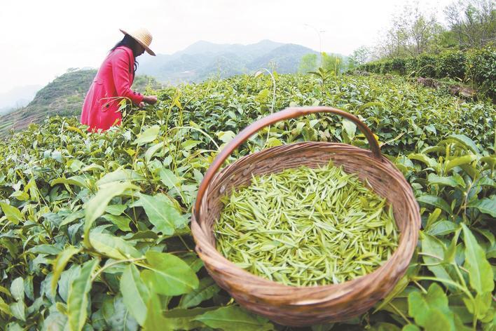鄖陽(yáng)區(qū)譚家灣鎮(zhèn)五道嶺村茶農(nóng)在茶園采摘茶葉