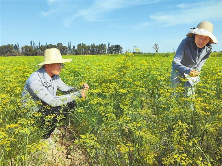 “種茴香省工省力,耗水少,市場價格相對穩(wěn)定,在每斤5元以上,效益比較可觀。今年我們種植了鐵桿茴香,通過施入生物菌肥‘保根120’,茴香表現(xiàn)出了優(yōu)異的抗重茬、防根腐等效果,預(yù)計產(chǎn)量不錯。”黃花農(nóng)場產(chǎn)業(yè)發(fā)展部副部長張月娥介紹,她一邊觀察茴香長勢,一邊測定土壤墑情。