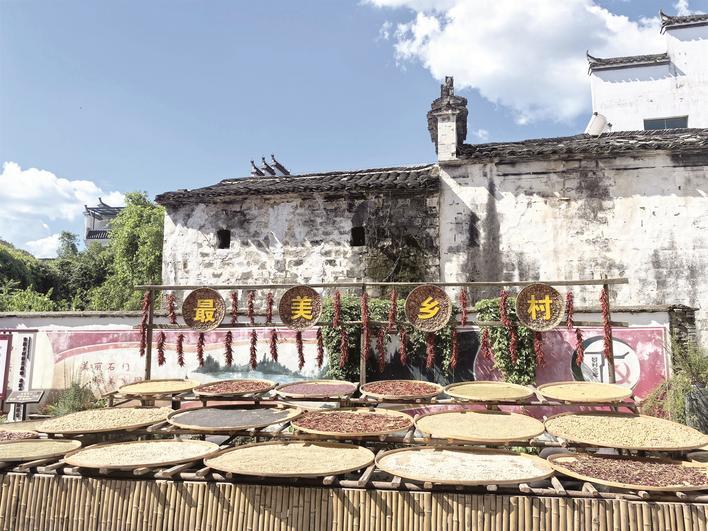 在石門村,自然風(fēng)光與文化底蘊(yùn)交相輝映。村內(nèi)廣場上,一排排曬盤盛滿了紅豆、玉米、辣椒等農(nóng)產(chǎn)品,展現(xiàn)了婺源人傳統(tǒng)的曬秋習(xí)俗。