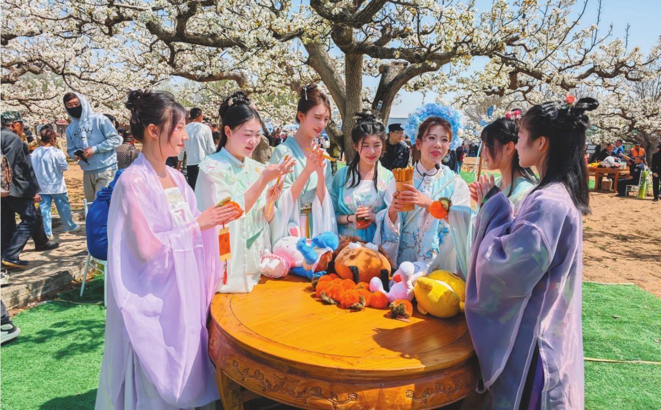 范家滿族鄉(xiāng)百年梨園的梨花節(jié)上,游客身穿古裝打卡(綏中縣委宣傳部供圖)