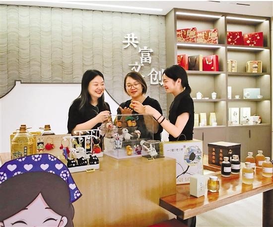 記者(左)與塘棲村鄉(xiāng)村CEO沈燕芬等人一起探討枇杷文創(chuàng)產品開發(fā) 丁華芳 攝