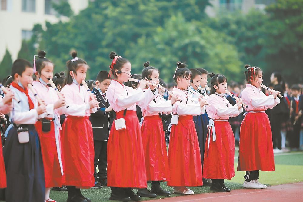 “伡鼓隊(duì)籌備4個(gè)月了,目前教師隊(duì)伍已由鄉(xiāng)土音樂專家培訓(xùn)并出師,基礎(chǔ)教材也編寫完畢,下學(xué)期就可以呈現(xiàn)在音樂課堂上?!逼翁锏谑袑W(xué)音樂組教師郭劍光說。