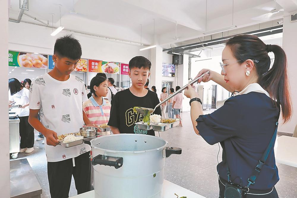 為了讓學生吃飽吃好,學校食堂請來了掌勺多年的師傅?!昂_呴L大的孩子在家吃多了海鮮,我們會多做肉類菜品,午餐晚餐保證兩葷兩素一湯,能做到兩周內(nèi)食材不重復(fù),一個月內(nèi)讓學生吃上超過30種不同食材,確保營養(yǎng)均衡?!秉S韶輝說。