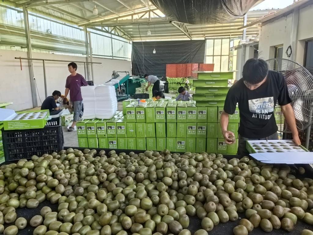 9月19日,在岳西縣古坊鄉(xiāng)徐志鵬的果園分揀倉庫,工人正在給獼猴桃打包發(fā)貨(受訪者供圖)