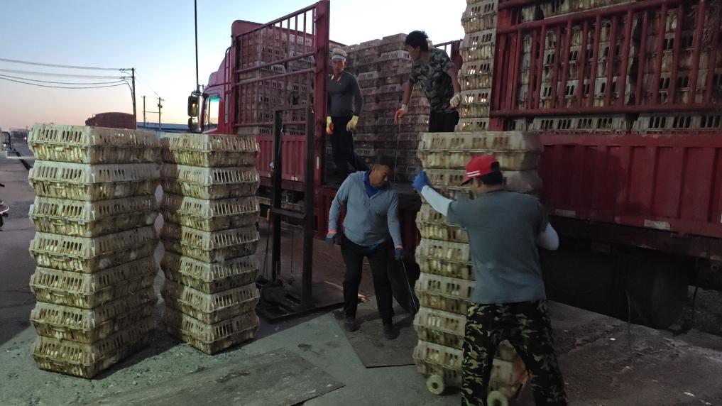 9月22日清晨,立業(yè)養(yǎng)殖農(nóng)場工人正在將肉雞裝車(受訪者供圖)
