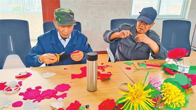 襄城縣湛北鎮(zhèn)區(qū)域綜合養(yǎng)老服務(wù)中心的老人們?cè)诰毩?xí)剪紙技藝。受訪者供圖