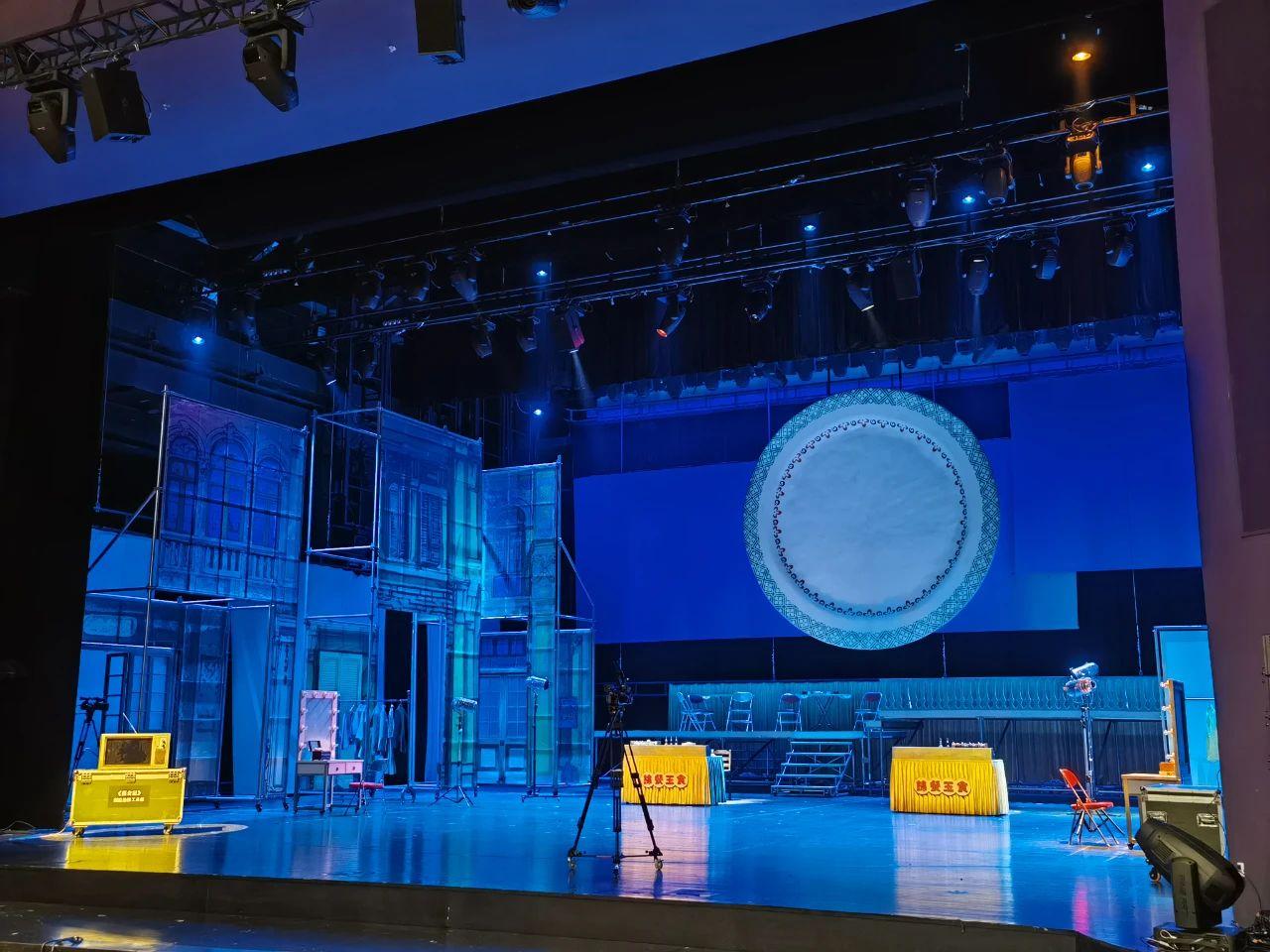 舞臺上采用廣彩瓷紋樣投影,時(shí)現(xiàn)字幕或特寫,延伸了舞臺表演;亦堪當(dāng)電視屏幕,是師徒名廚爭霸現(xiàn)場;更是一輪圓月,時(shí)代風(fēng)云際會(huì),日中與夕食,月下共朝歌。有無相生間,承載的是中國人的道理。