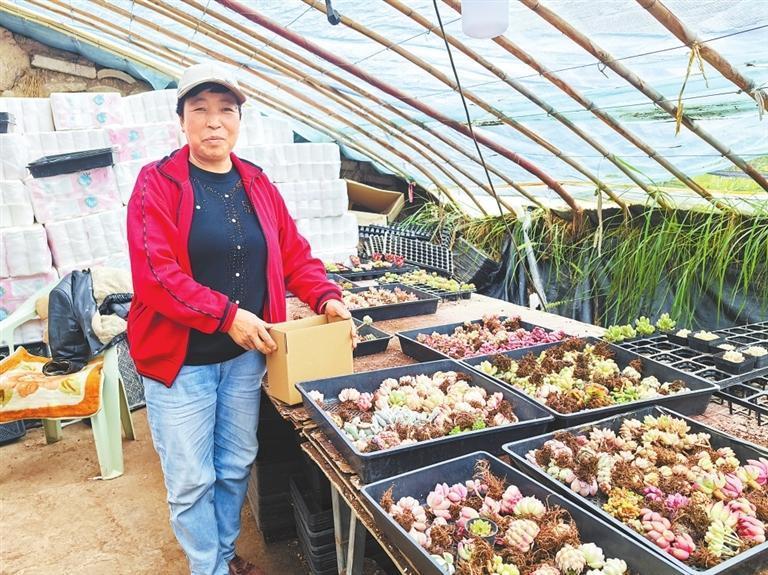 “瞧這些多肉植物小巧可愛,讓城里人親近大自然吧,網(wǎng)上賣得很火?!贝迕駨埵缬⑦叴虬b邊說,“通常老板們上午直播帶貨,下午我們就按照貨單挑貨、抖土、晾干,再裝貨,保持多肉植物不爛根。平時(shí)打理好這些植物,活很輕松,月收入2800元,還能兼顧種好家里5畝地。”