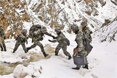 5月上旬,新疆克孜勒蘇軍分區(qū)邁丹邊防連官兵前往海拔4000多米的某點(diǎn)位開展例行武裝巡邏,加大對(duì)高海拔防區(qū)的執(zhí)勤管控力度,確保邊境安全穩(wěn)定。圖為官兵協(xié)助越冰河。