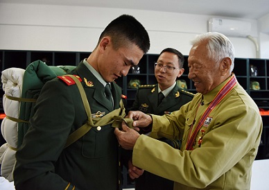 圖為在武警合肥支隊執(zhí)勤十八中隊?wèi)?yīng)急班,抗美援朝老戰(zhàn)士鄭尊禮(右)向戰(zhàn)士們演示完打背包后,給戰(zhàn)士李文強(qiáng)整理背包。