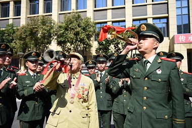 剛擔(dān)任司號員不久的下士孔祥輝主動跟鄭尊禮取經(jīng),學(xué)習(xí)軍號吹奏經(jīng)驗。兩人一起合奏沖鋒號,把現(xiàn)場官兵帶回那個硝煙彌漫的戰(zhàn)場。