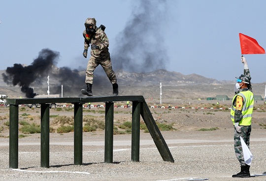 圖為“安全環(huán)境”項目舉行接力賽,中國陸軍參賽隊隊員通過獨木橋。 張永進 攝