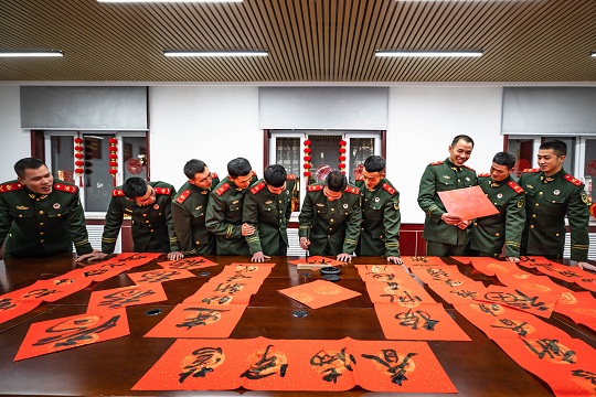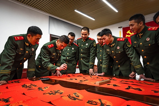 圖為官兵們?cè)趯?xiě)春聯(lián)。金玥林 攝