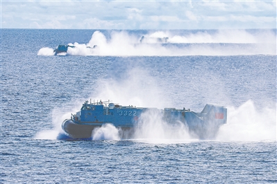 海上威脅剛解除,新的“敵”情傳來。接到命令,數(shù)艘氣墊艇搭載登陸兵力駛離母艦,在海上組成登陸編隊,朝目標(biāo)高速奔襲……