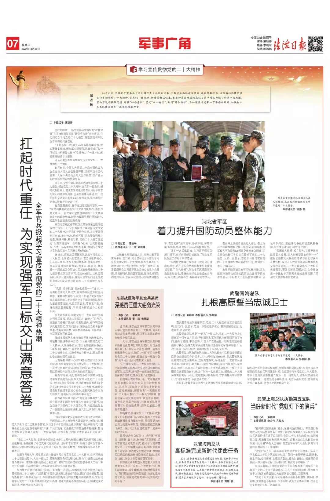 近日,武警海南總隊官兵通過宣傳板報、報紙等多種形式,認真學習宣傳貫徹黨的二十大精神。全體官兵堅定地表示,要將學習宣傳貫徹黨的二十大精神煥發(fā)出的政治熱情,轉(zhuǎn)化為堅守工作崗位、認真履行職責的精神動力,加強練兵備戰(zhàn)、磨礪打贏能力,高標準完成黨和人民賦予的新時代使命任務(wù)。
