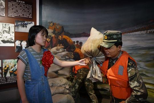 圖為武警工程大學(xué)學(xué)員萬(wàn)鴻玥在武警安徽總隊(duì)合肥支隊(duì)史館父親萬(wàn)四海的雕像旁緬懷追思。徐偉 攝
